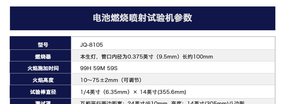 產(chǎn)品型號:JQ-8105 品牌:劍 喬 用途:燃燒噴射試驗機(jī)用于汽車用途動力鋰原電池和其它原電池、以及鋰離子電池、鎳氫、鎳鎘以及磷酸鐵鋰電池或者動力鋰電池模塊的外殼材料顆粒燃燒或電池咨詢熱線:13829135130